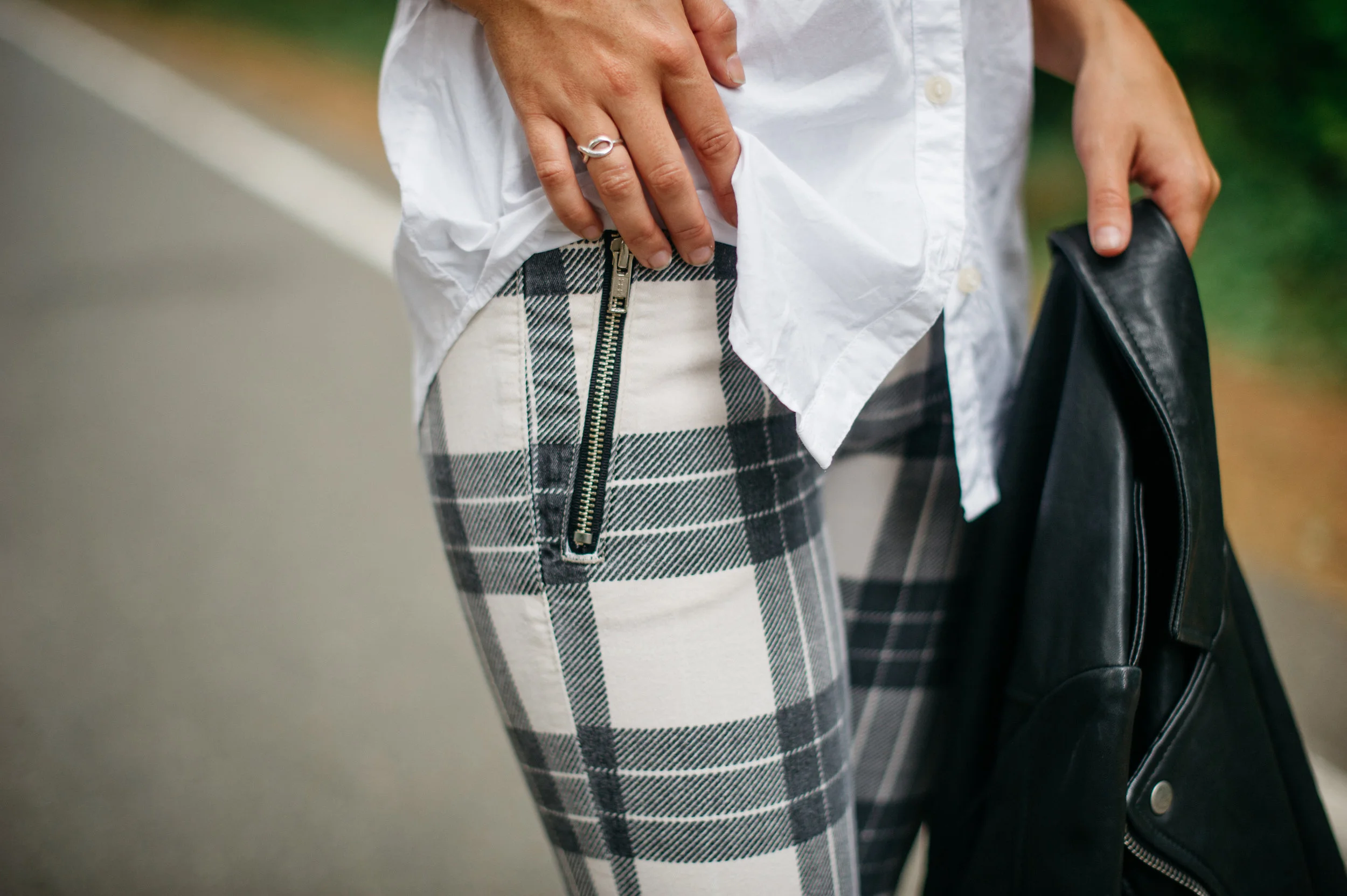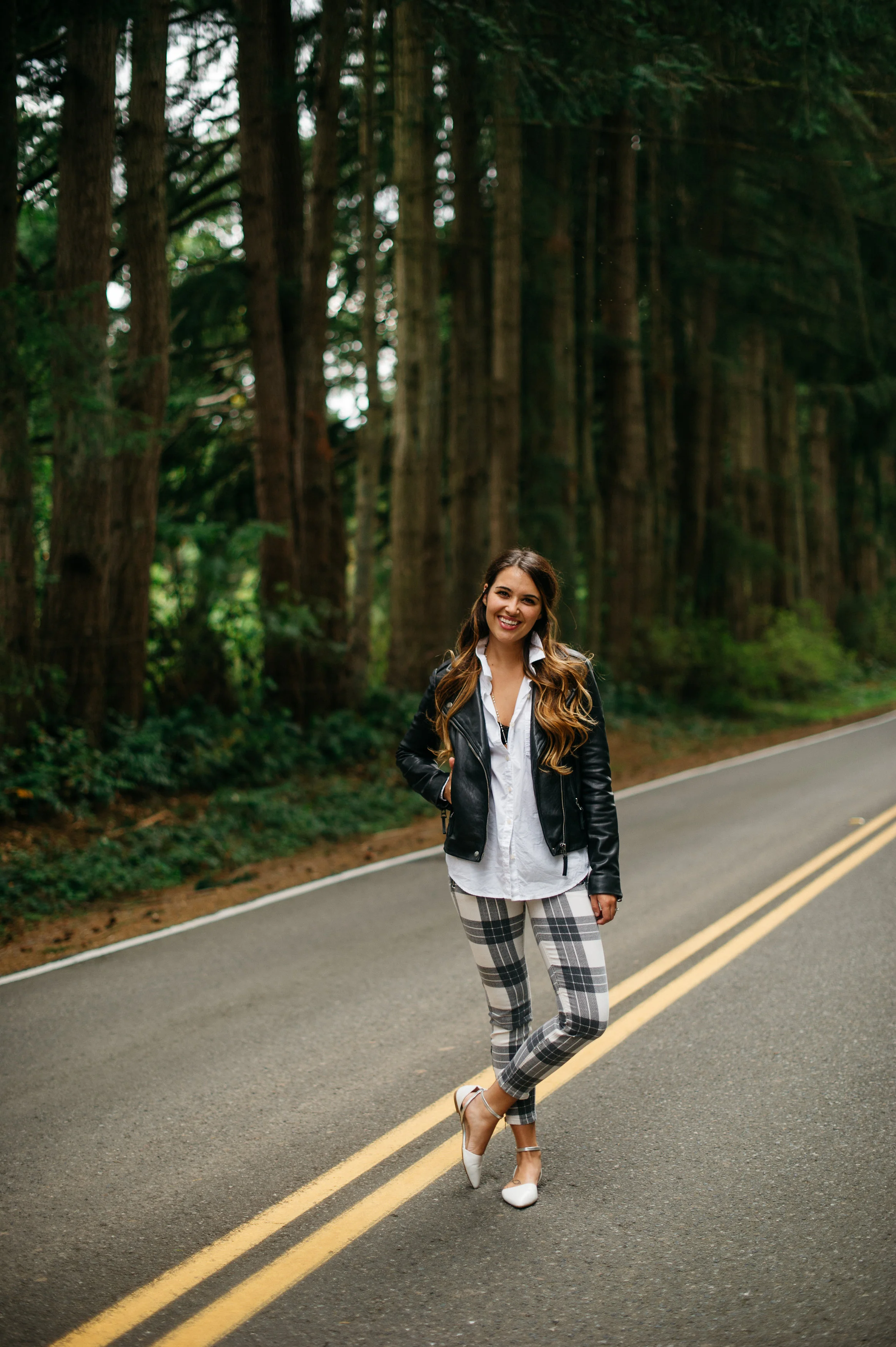 I seriously can't get enough plaid in my life, it is my go to print these days. I have had these pants since last fall and I think they are a piece I will keep forever, they fit like a glove and are part tailored trouser - part moto skinny pant. I love pairing stark white with them to contrast the cream hues in the print, I think its always more fun to break the rules a bit. By adding my leather jacket I think it gives them a slight rock and roll vibe...the only thing that would make this look any better would be a killer black chunky heel to spice things up.